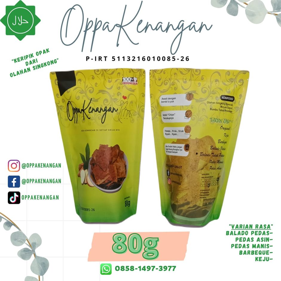 Usaha dari Oppakenangan ini sudah ada sejak tahun 2019. Nama dari “Oppakenangan” adalah kreasi dari pemiliknya dan merupakan singkatan dari “Opak”, keripik olahan dari singkong dan “Kenangan”. Kata “Kenangan” sendiri berasal dari kenangan warisan almarhum orang tua Bu Kiki yang mewariskan usaha opak ini. Kemudian kedua kata itu digabung menjadi nama Oppakenangan.